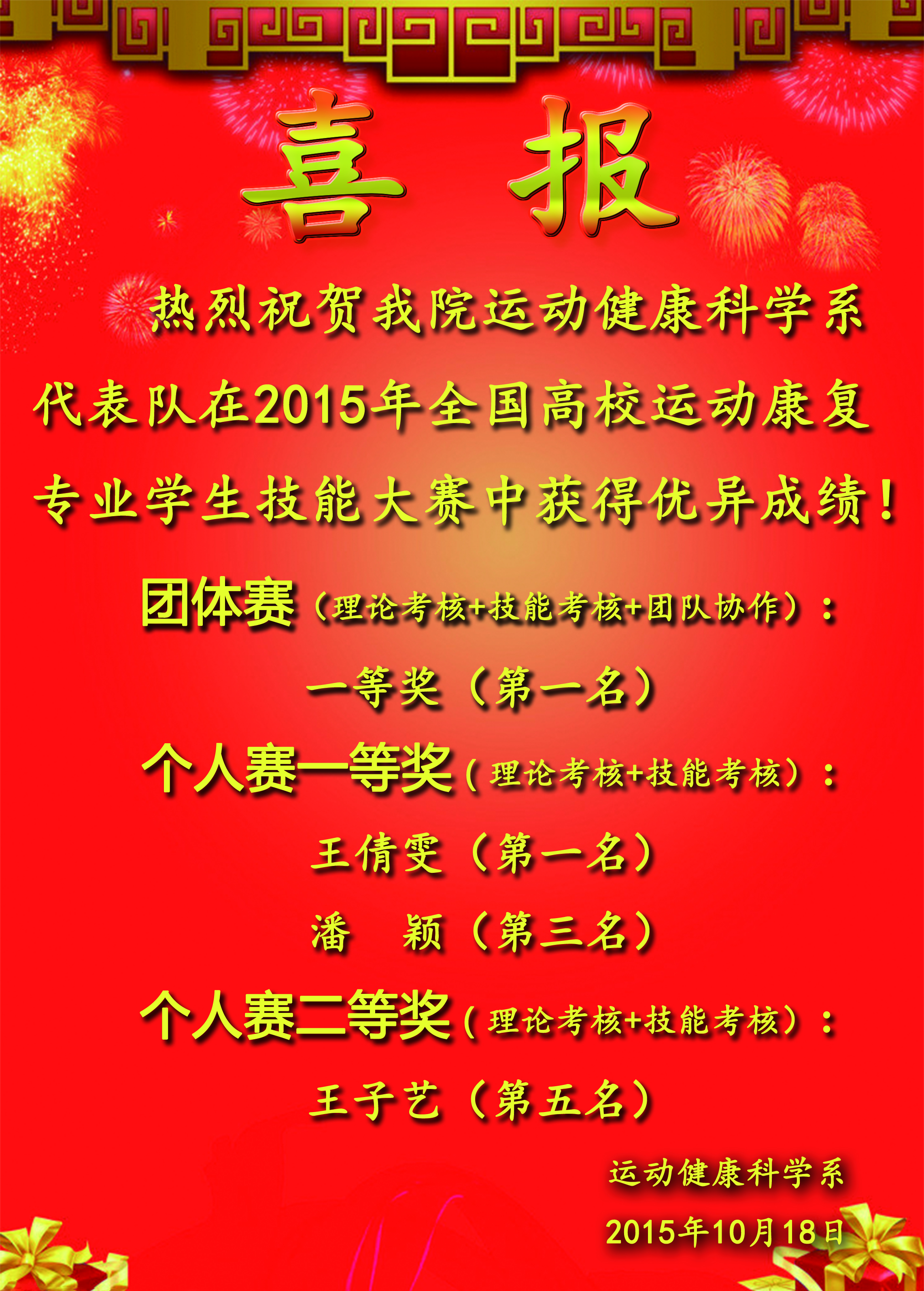 喜报:我系学生在2015年全国高校运动康复专业学生技能大赛中包揽团体赛和个人赛的冠军