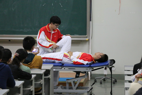 实战模拟比赛由专业负责人赵彦老师主持。赵老师介绍了参赛项目及规则,队员夏啸宇、张磊同学分别为大家展示了运动牵拉和贴扎技术,他们清楚的表述,酷炫的操作,让同学们大开眼界。随后是团体比赛项目,以膝关节损伤为案例,参赛选手需要通过问诊、检查、评估、康复各各环节的协调配合,全面展示康复治疗师的专业素质及能力。潘颖同学亲和的问诊,王倩雯同学专业的检查评估,王子艺同学规范的康复技能操作博得了学弟学妹们的阵阵惊叹。模拟比赛以马林老师的点评收尾,她对选手们的整体表现给予了充分的肯定,也指出了考核过程中存在的一些不足,勉励大家精益求精,不断进步,力争取得好成绩。