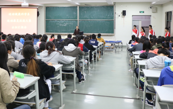 2015年10月12日晚,距“2015年全国高校运动康复专业学生技能大赛”只有四天,运动健康科学系组队参加比赛的5名队员和15级全体新生齐聚教学实验楼阶四教室,隆重召开出征前实战模拟汇报活动。系主任孙飙、副主任马林、杨晖及相关指导教师出席了活动。