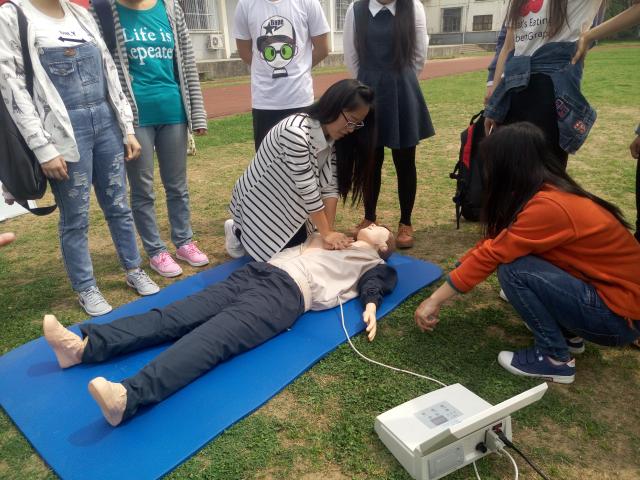 作为本次教学活动主讲人,喻菊老师详细讲解并演示了心肺复苏术的操作流程。同学们认真听讲,不时拿出手机拍摄记录。灼热的日光也抵挡不住大家对急救知识的浓厚兴趣。教学过程中,喻老师风趣幽默的语言让社员在欢声笑语中掌握了心肺复苏术的要点。