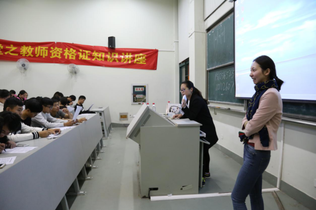 主讲人谢老师以“非洲卖鞋”的故事作为讲座的切入点,激发了同学们的兴趣,接着她从“为什么找不到满意的工作”,“谈谈教师职业”,“如何备考教师资格证”三个方面对教师行业做了细致的讲解。谢老师利用图表和热点新闻分析了当前就业形势,让同学们较快地对就业问题有了深入的了解。谢老师也就近几年的毕业大学生的就业问题做出了自己的独特见解。谢老师生动形象的解讲调动了同学们的积极性,现场气氛活跃,同学们积极参与互动提问。