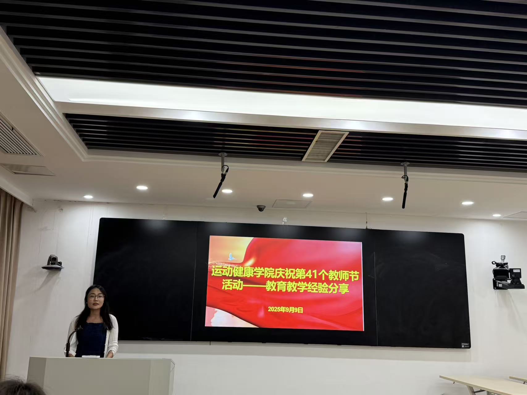 在第41个教师节来临之际,为进一步弘扬尊师重教、崇智尚学的优良传统,展示学院教师立德树人、自信自强的精神风貌,9月9日下午,运动健康学院庆祝第41个教师节活动暨教育教学经验分享会在图书馆第二报告厅举行。活动由副书记刘莉主持。