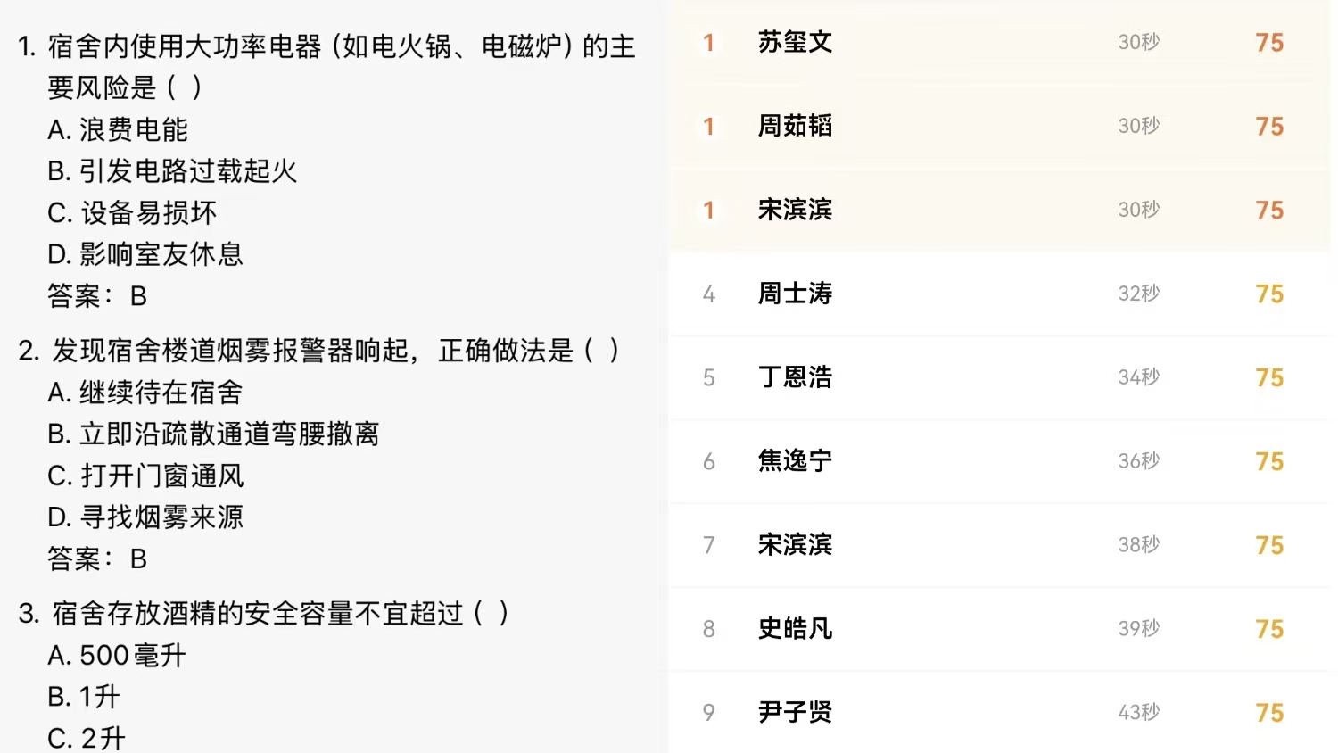 宿舍安全知识竞赛与学校第十四届大学生安全知识学习竞赛有机结合,以宿舍为单位组队参赛。竞赛题目聚焦电器使用规范、消防器材操作、防盗防骗技巧、应急处理流程等核心内容。各参赛宿舍沉着应答、默契配合,在激烈角逐中夯实了安全知识基础,提升了应急处置能力,有效强化了全院学生的宿舍安全防范意识。最终,3间宿舍分获一、二、三等奖。