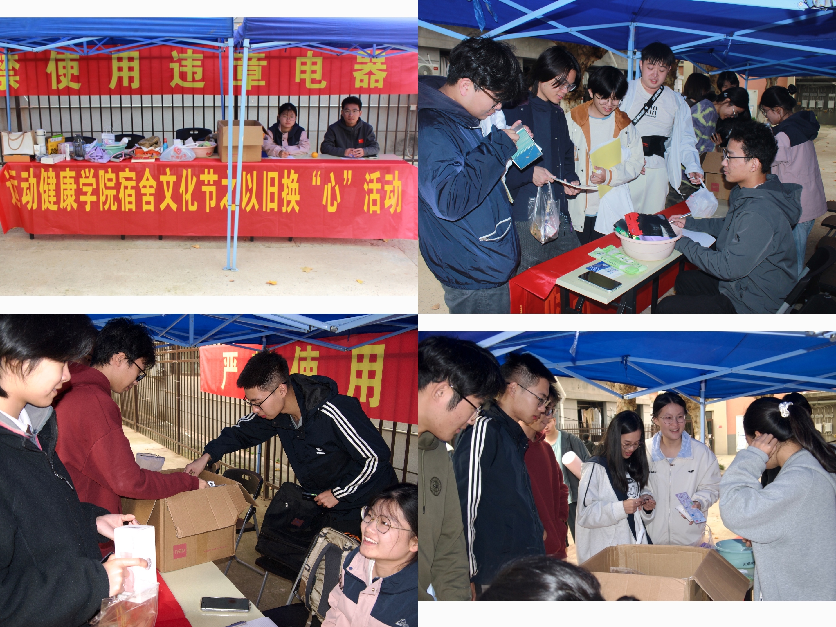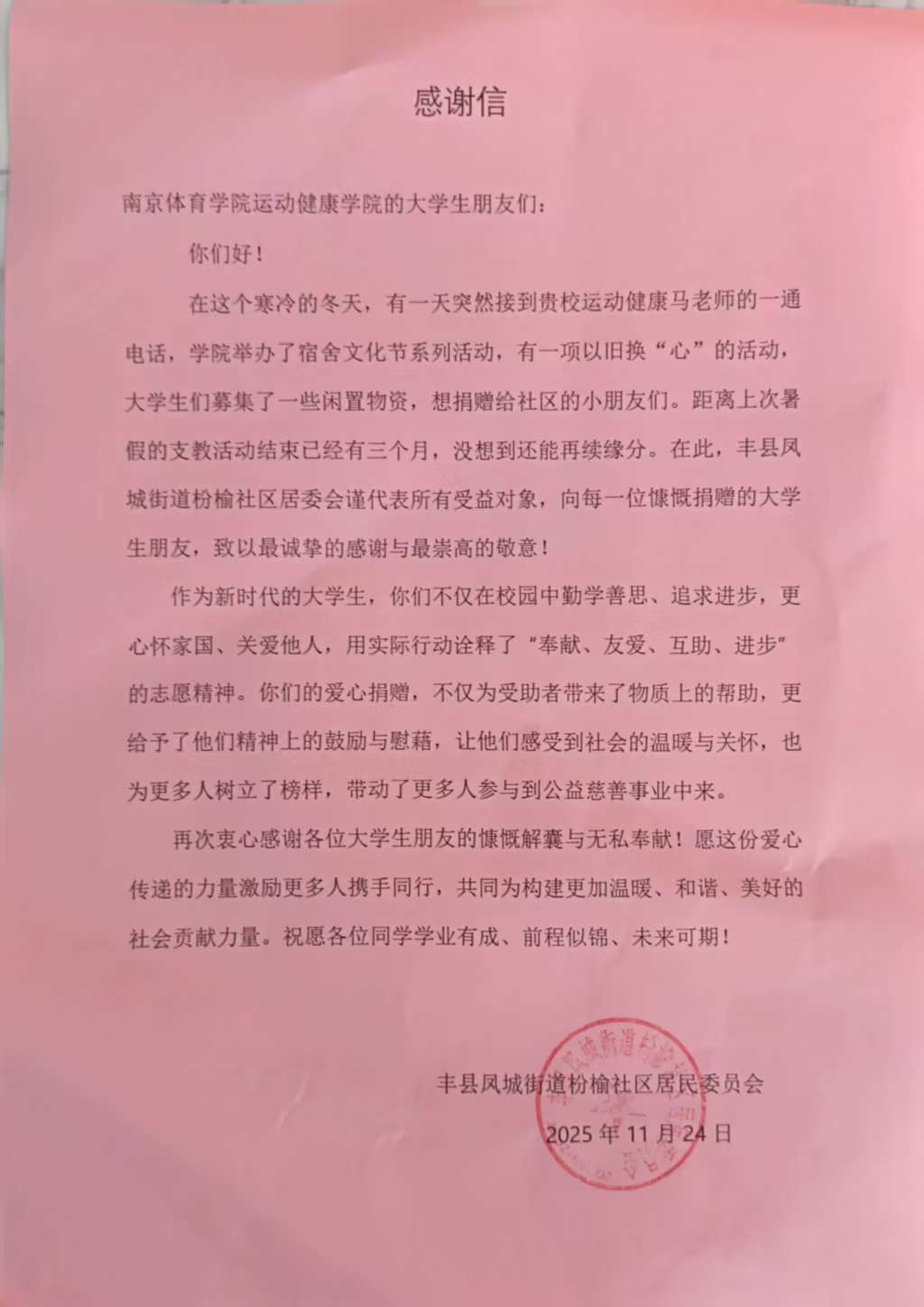 以旧换“心”活动倡导资源循环利用,各宿舍将闲置的书籍、文具、衣物等物品带到指定摊点,通过互换实现“旧物新生”。活动现场设置了分类展示区,同学们认真挑选心仪物品,交流使用心得,既践行了环保理念、减少了资源浪费,又增进了同学间的互动交流。活动尾声,学院志愿者将部分物品分类打包,贴上写有“运动健康学院学子爱心捐赠”的标签,送往学院2025年暑期社会实践地—— 徐州丰县枌榆社区。这批承载着爱心的物资得到了当地群众的热烈欢迎与高度赞誉,徐州丰县枌榆社区特发来感谢信,让宿舍温情延伸至校园之外。
