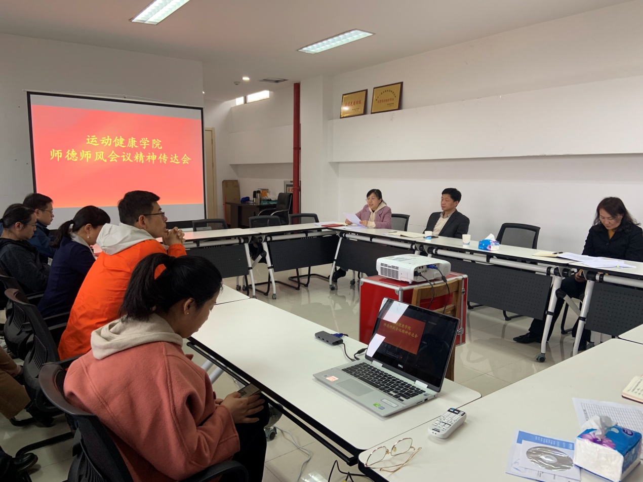 42日中午,运动健康学院在图书馆415会议室召开会议,传达师德师风建设会议精神,院长汤强、党总支副书记石红霞出席会议,学院全体教师参加会议。会议由副院长赵彦主持。