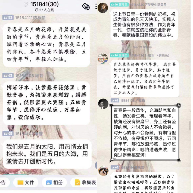 2021年是中国共产党成立100周年,为充分表达对中国共产党的热爱、对党领导下祖国辉煌成就的赞颂,151841团支部、151842团支部组织开展“五四正青春,奋斗正当时”寄语活动,通过线下和线上的学习、讨论和分享,帮助团员青年准确把握五四运动历史意义和时代价值,以史为鉴、以史为师,坚定中国特色社会主义道路自信、理论自信、制度自信、文化自信,在五四火炬的照耀下,以振奋的精神、昂扬的斗志,凝聚起全民族的磅礴力量,为全面建设社会主义现代化国家、实现中华民族伟大复兴的中国梦不懈奋斗。