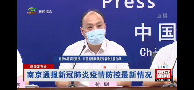 86日,南京市人民政府新闻办公室召开第17场南京新冠肺炎疫情防控新闻发布会,运动健康学院教授孙飙受邀参加本次会议。同时出席会议的还有南京市卫健委副主任杨大锁、南京市疾控中心消毒与病媒生物防治科主任医师张守刚、高淳区副区长邱峰。