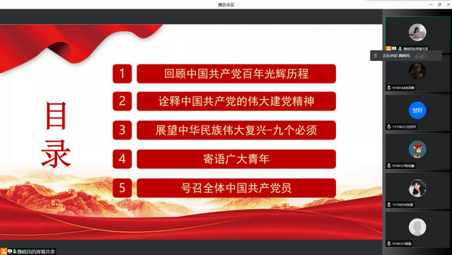 会上,魏晓民从回顾百年光辉历程、诠释中国共产党的伟大建党精神、展望中华民族伟大复兴、寄语广大青年、号召全体共产党员五个方面带领全体团学干部学习了讲话精神的要点,重点介绍了总书记对广大青年的寄语,“未来属于青年,希望寄予青年”,希望大家作为学生干部,发挥带头示范学、带动广泛学的作用,在班级掀起学习热潮,带领全体同学学习伟大的建党精神,以实现中华民族伟大复兴为己任,增强做中国人的志气、骨气、底气,不负时代,不负韶华,在奋斗中绽放绚丽的青春之花。最后,由团学干部代表分享学习心得,大家纷纷表示将以习近平新时代中国特色社会主义思想武装头脑,不断增强“四个意识”、坚定“四个自信”、做到“两个维护”,响应伟大号召,树立家国情怀,为实现第二个百年奋斗目标贡献青春力量。