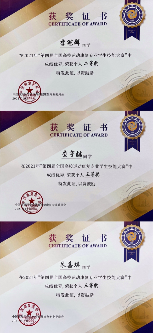 大赛期间,团队凭借扎实的理论知识基础和出色的专业技能表现,获得了评委的首肯,战胜了多支综合、医学和体育院校代表队,荣获运动康复本科组团体二等奖。其中,李冠群同学荣获个人二等奖,查宇喆、朱嘉琪同学荣获个人三等奖,团队取得优异成绩,三位指导教师荣获优秀指导教师奖。