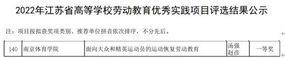 近日,江苏省高等教育学会公布了2022年江苏省高等学校劳动教育优秀实践项目评选结果,我院汤强和赵彦的《面向大众和精英运动员的运动恢复劳动教育》荣获一等奖。