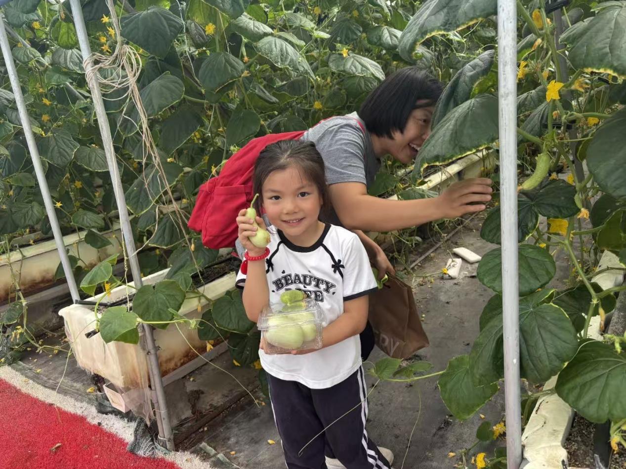 “黄瓜是长在架子上的!”走进果蔬区,宝贝们瞬间变身“小小农夫”领队老师的指导下,他们小心翼翼地摘下饱满的挂着露珠的黄瓜。宝宝们举着自己摘的小黄瓜,笑得眼睛眯成了一条线;大班的哥哥姐姐则当起了“小帮手”,提醒小伙伴“要轻轻摘,别伤到植物哦”。亲手收获的果实,每一口都带着甜甜的成就感。