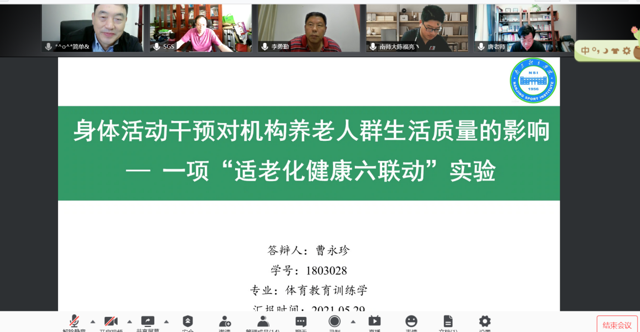 2021529日,我校2021届硕士研究生学位论文首批答辩圆满完成。本次答辩采用腾讯会议线上形式,由南京师范大学体育学院、扬州大学体育学院、南京晓庄学院体育学院、沈阳体育学院、吉林体育学院、陆军工程大学等9所高校22名专家担任答辩委员会主席,34名校内外专家担任答辩委员,132名硕士研究生参加此次答辩。