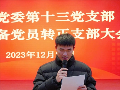 会议严格按照党员转正流程,四位预备党员依次宣读《转正申请书》,向党组织汇报自己在预备期内的表现具体表现并提出了转正申请。各党小组组长介绍了四位同志在预备期的表现,并对其能否转正提出意见。支部委员会代表向支部大会报告预备期教育考察情况;与会党员发表意见并进行充分讨论;经大会举手表决,第十三党支部书记孙国友宣布党支部大会决议,经过无记名投票,一致同意王语馨、高强、王万圣、夏露等四位预备党员按期转为中共正式党员。