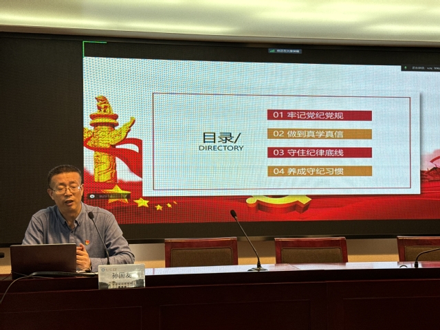会上,孙国友开展《党纪学习教育的着力点》专题党课,通过“牢记党纪党规、做到真学真信、守住纪律底线、养成守纪习惯”四个维度,对《中国共产党纪律处分条例》的内容以及新修订部分进行重点讲解,他指出,全体党员要时刻“学纪、知纪、明纪、守纪”,在日常学习生活中严于律己、廉洁自律、率先垂范,真正做到学《条例》、悟思想、抓实干、强担当。
