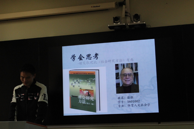 2017年4月13日上午9—11点,研究生部在教学实验楼的1501教室举行了一场研究生学术演讲。三位体育人文社会学专业的同学把自己近期的研究思考和同学们做了分享交流。岳莹莹同学向大家推荐了《粉丝经济》这本书;张恒同学分享了他读《社会研究方法》的感悟——学会思考;刘祥同学则向大家介绍了他阶段性的研究设想:体育产业与养老产业的融合。研究生部主任陈海波教授作为点评嘉宾对于本次学术演讲进行了点评。陈海波教授指出:学术演讲交流会的形式非常好,研究生的学习绝不是大五,大六的延续,应该是研究性学习。研究生要学会学习,学会读书,更重要的是学会思考,学会研究。希望广大研究生们能够静下心来投入时间和精力做好学问,做好研究。最后本次学术演讲的组织者,学科办副主任孙国友老师对于本次学术演讲会进行了总结。他希望这样的学术研究交流形式能够在研究生中常态化的进行下去,充分调动研究生们的研究积极性,提高研究生的培养质量。