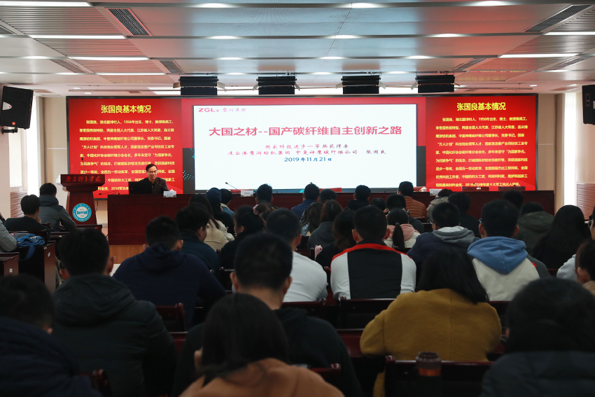 20191121日下午,在我校行政办公楼101会议室举行导师类产业教授聘任仪式后,张国良教授为全体研一学生作了题为《大国之材——国产碳纤维自主创新之路》的专题学术报告。校党委副书记、副校长史国生教授出席并主持。