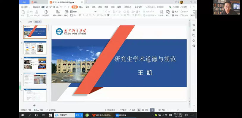 为加强研究生学术道德与规范教育,9月8日下午,我校体育教育与人文学院副院长(主持工作)王凯副教授为2021级研究生开展了“研究生学术道德”主题讲座,此次讲座采用线上直播的授课方式。