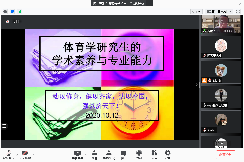 王教授希望我们能够在研究生阶段做好十件事,表明当务之急是应学会批判思维,从更深度更全面的角度看问题,要求我们还原体育本意——体育本质是人的身体活动,其他一切不过是溢出价值而已。体育是一个挑战与机遇并存的行业,同学们作为体育人一定须具备的专业性,为现代体育发展增光添彩!