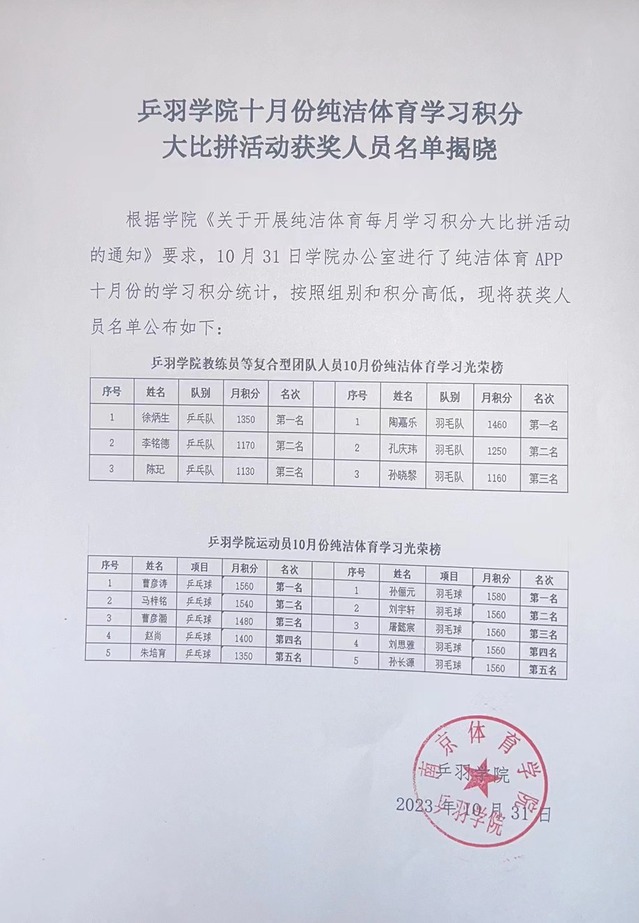 乒羽学院十月份纯洁体育学习积分大比拼活动获奖人员名单