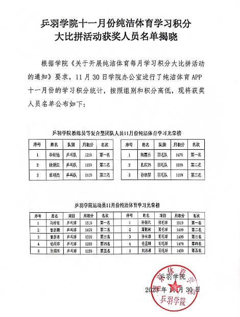 乒羽学院十一月份纯洁体育学习积分大比拼活动获奖人员名单揭晓