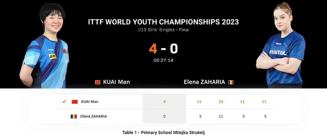 U19女单决赛中,蒯曼展现了强大的统治力,11:3,13:11,11:5,11:5,总比分4:0零封罗马尼亚选手伊莲娜夺得冠军。