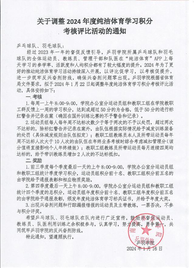 关于调整2024年度纯洁体育学习积分考核评比活动的通知
