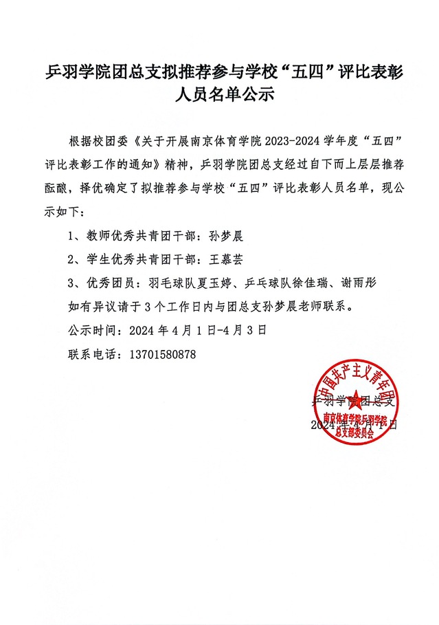 乒羽学院团总支拟推荐参与学校“五四”评比表彰人员名单公示