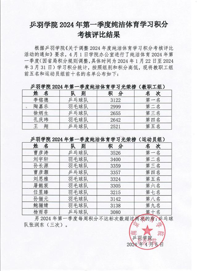 乒羽学院2024年第一季度纯洁体育学习积分考核评比结果