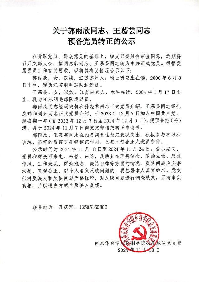 关于郭雨欣同志、王慕芸同志预备党员转正的公示