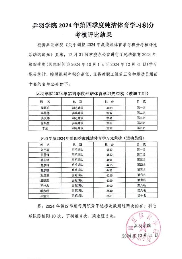 乒羽学院 2024 年第四季度纯洁体育学习积分考核评比结果