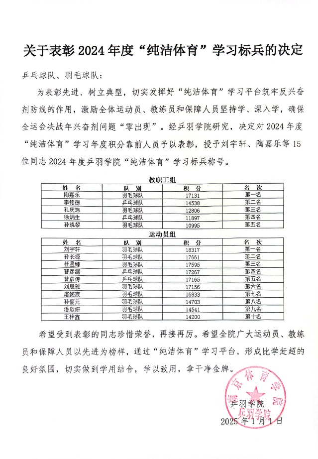 关于表彰 2024 年度“纯洁体育”学习标兵的决定