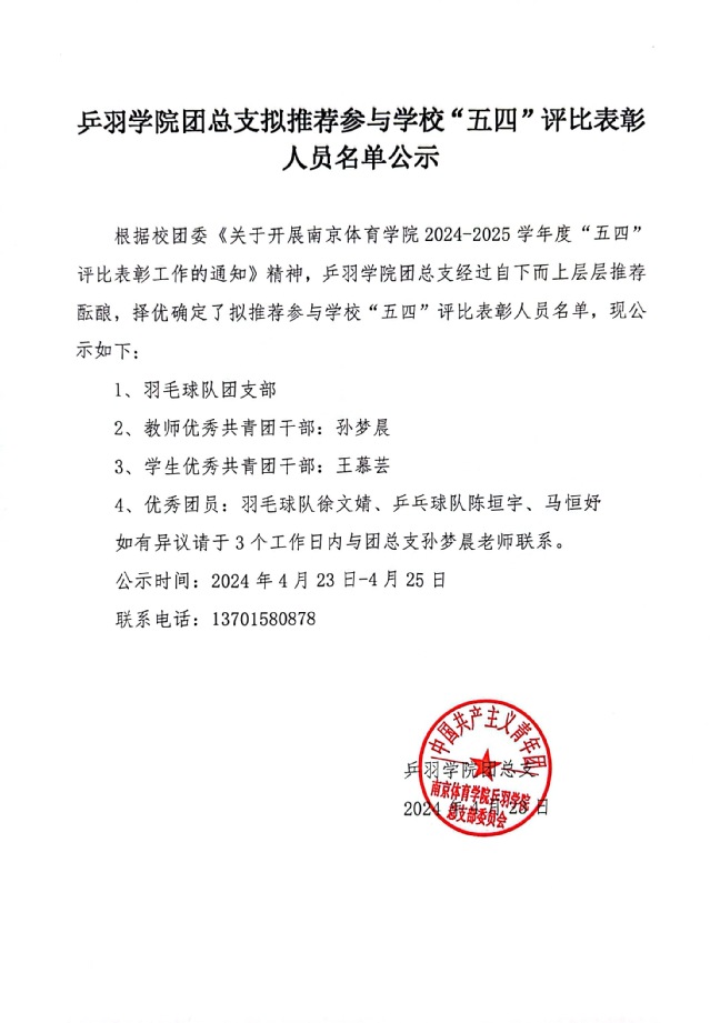 乒羽学院团总支拟推荐参与学校“五四”评比表彰人员名单公示