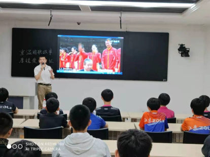 为加强运动员党史学习教育,培养爱国主义精神,树立远大理想,以满腔热情庆祝中国共产党诞生100周年,6月15日晚上,特邀党委副书记兰亚明为乒乓球队运动员上一堂《重温国歌故事、厚植爱国情怀》为主题的党史教育课。