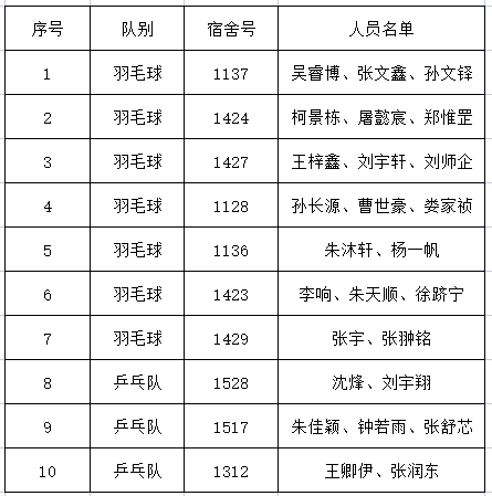根据学院《关于开展每月运动员“标兵宿舍”评选工作的通知》要求,329日学院组织管理干部和教练员代表对所属两个项目的运动员公寓的卫生安全进行了集中检查,经过打分排序,以下宿舍获评“标兵宿舍”:
