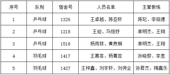 乒羽学院四月份运动员“标兵宿舍”评选结果