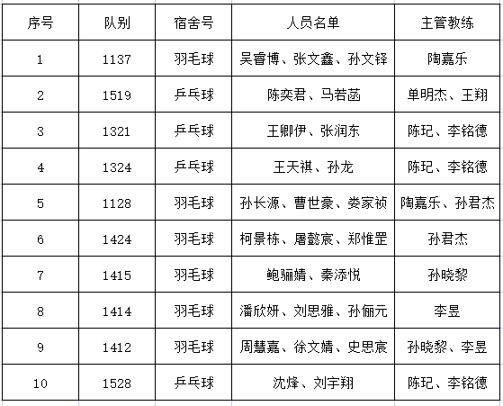 根据学院《关于开展每月运动员“标兵宿舍”评选工作的通知》要求,424日学院组织管理干部和教练员代表对所属两个项目的运动员公寓的卫生安全进行了集中检查,经过打分排序,以下宿舍获评“标兵宿舍”: