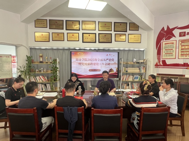 4月16日上午,游泳学院在跳水花游馆二楼会议室召开2025年全面从严治党暨党风廉政建设工作会议。学院全体管理干部、各支部委员参加会议。