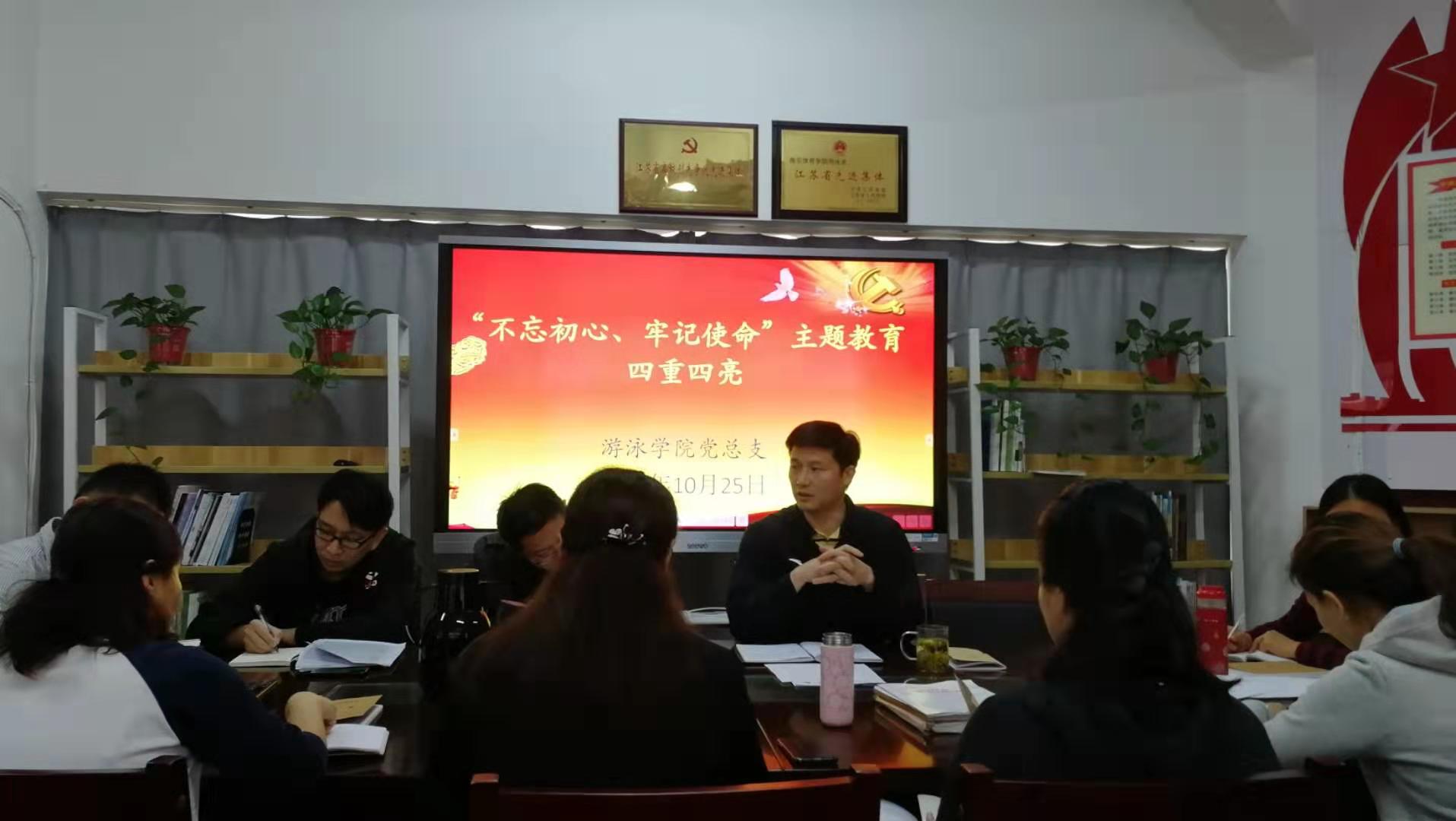 为了深入贯彻 “不忘初心,牢记使命”主题教育活动相关要求,提升党员意识,发挥党员作用,加快推进游泳学院训练备战。10月25日上午,游泳学院党总支在跳水花游馆二楼会议室开展了“四重四亮”主题教育活动,游泳学院党总支全体党员参加了活动。会议由党总支书记、院长王伟新主持。