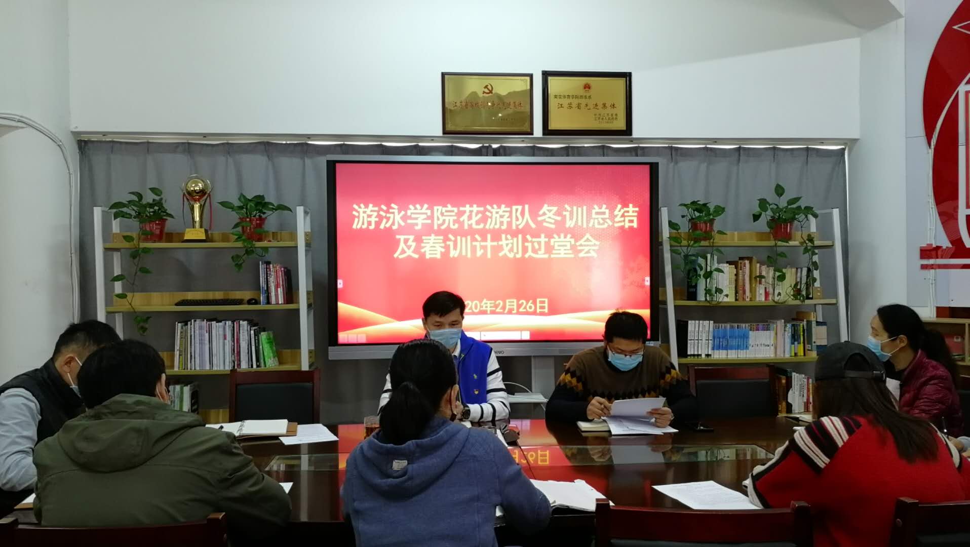 2月26日上午,游泳学院花样游泳队在跳水花游馆二楼会议室召开2020年冬训总结、春训计划过堂会。游泳学院全体党总支委员、花游队管理干部和教练员参加了会议。