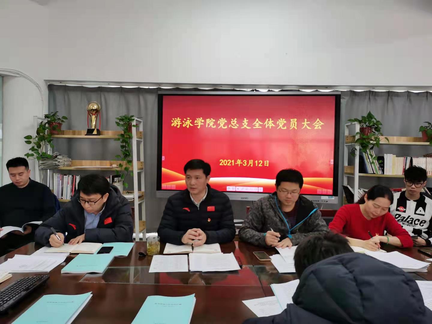 3月12日上午,游泳学院党总支在跳水花游馆二楼会议室召开全体党员大会暨2021年党建工作、党史学习教育动员部署会,游泳学院全体党员参加了会议。会议由党总支副书记陈志主持。