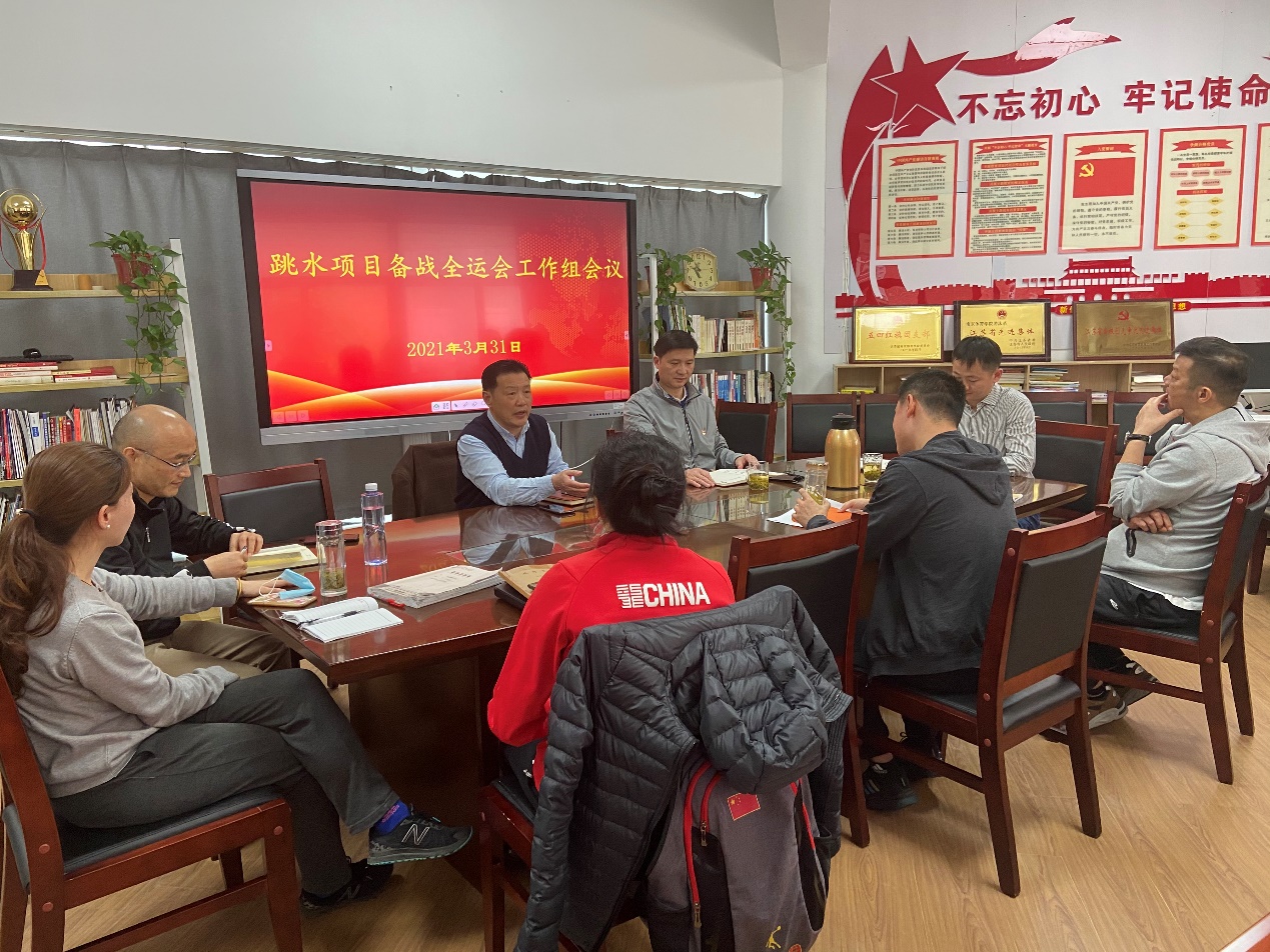 最后,副校长金松对备战工作组的工作进行了部署:一是围绕跳水全运会资格赛、决赛的具体时间,主带教练认真制定训练和管理工作计划,针对训练难点,积极与国家队教练沟通,在第一时间解决问题;二是科医保障团队对重点运动员的伤病治疗、体能康复制定针对性训练计划,为重点队员顺利参加全运会资格赛、决赛保驾护航。