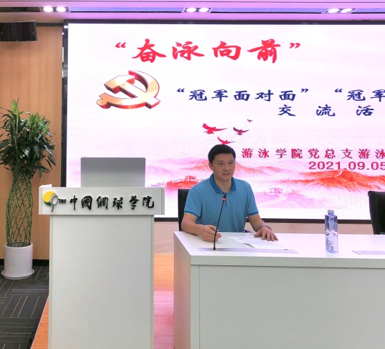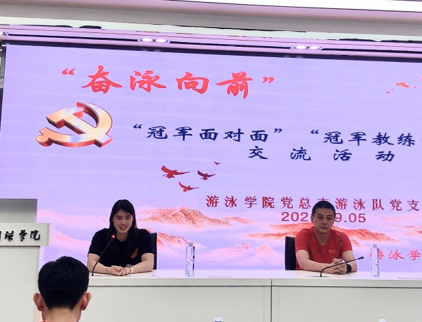 9月5日16:00,游泳学院党总支游泳队党支部在中国网球学院三楼会议室举行“冠军团队面对面”主题交流活动,邀请张雨霏和她的东京奥运会备战团队成员现场交流东京奥运会夺冠的成功经验。游泳学院党总支书记、院长王伟新,副书记陈志,游泳队在校全体管理干部、队医、教练员、运动员参加了会议。会议由游泳队党支部书记张纪芳主持。